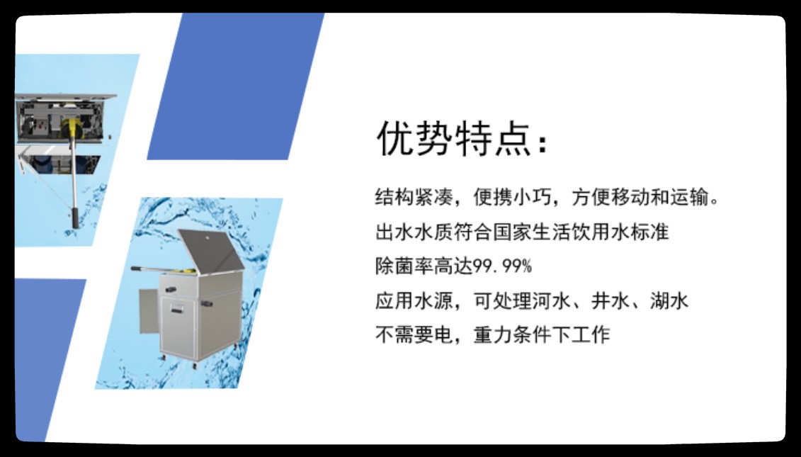 可适用于户外野营、应急救灾现场、户外探险、资源勘探等户外作业以及无电源地方饮用水使用